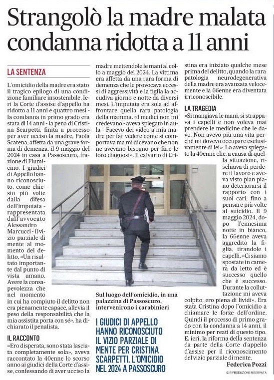 La Corte di Assise di Appello di Roma, ha riformato la sentenza di primo grado con la quale l′imputata era stata condannata previo riconoscimento delle circostanze attenuanti generiche prevalenti sulle aggravanti alla pena di anni 14 e riconoscendo il vizio parziale di mente, in accoglimento della proposta di concordato avanzata dalla Difesa con il consenso della Procura Generale, ha ridotto la pena ad anni 11 e mesi 4 di reclusione.
